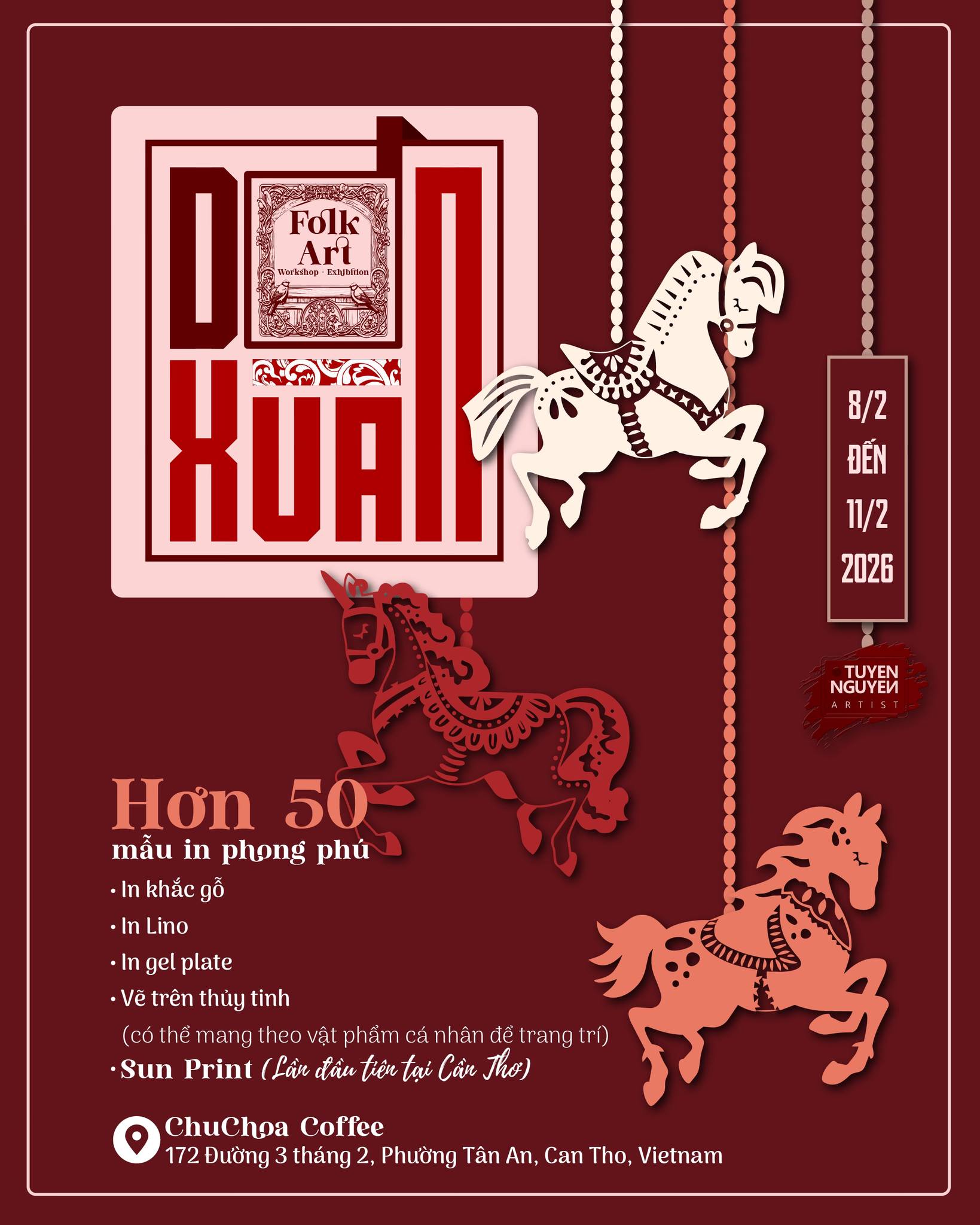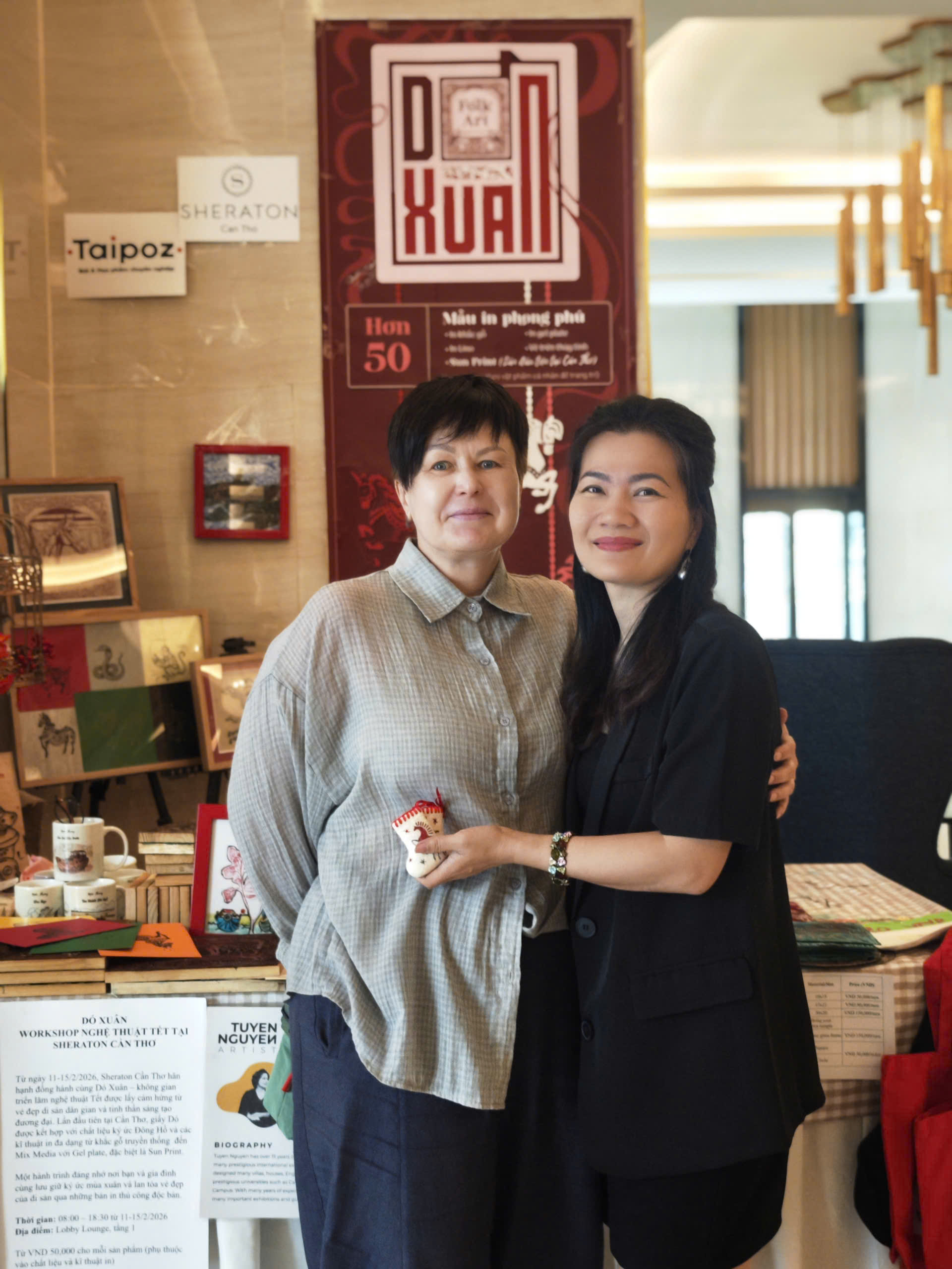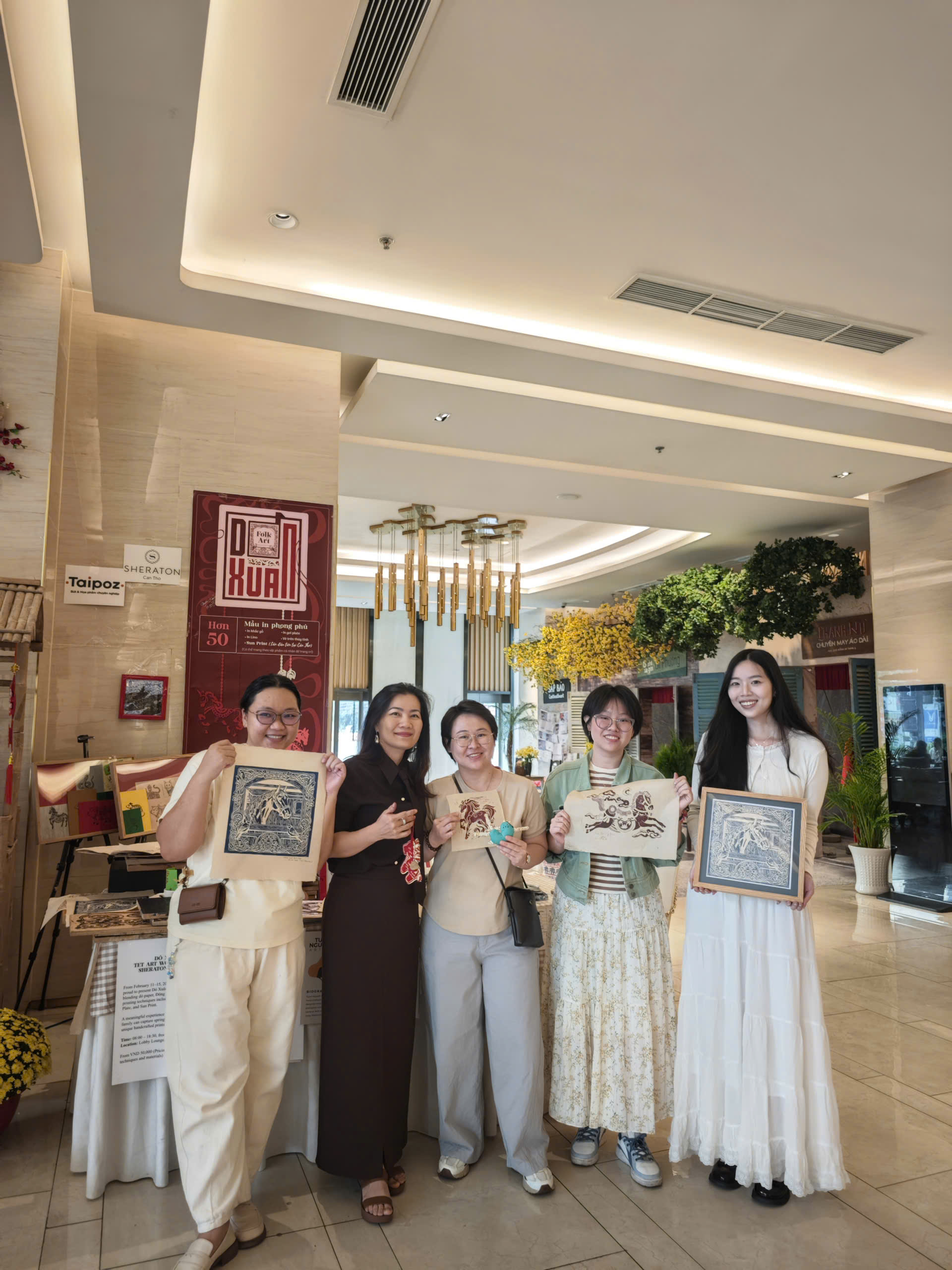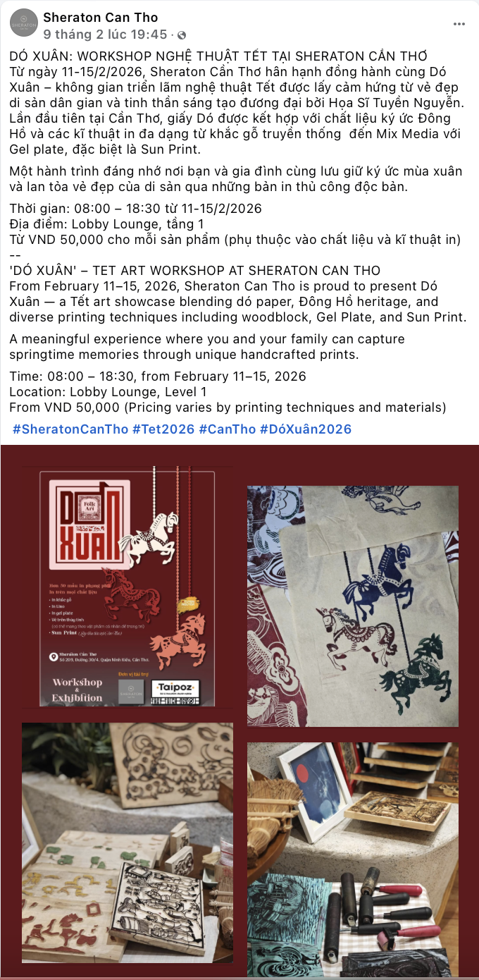 Từ ngày 11-15/2/2026, Sheraton Cần Thơ hân hạnh đồng hành cùng Họa sĩ Tuyền Nguyễn qua Workshop & Exhitition: Dó Xuân – không gian triển lãm nghệ thuật Tết được lấy cảm hứng từ vẻ đẹp di sản dân gian và tinh thần sáng tạo đương đại. Lần đầu tiên tại Cần Thơ, giấy Dó được kết hợp với chất liệu ký ức Đông Hồ và các kĩ thuật in đa dạng từ khắc gỗ truyền thống đến Mix Media với Gel plate, đặc biệt là Sun Print. 'DÓ XUÂN' – TET ART WORKSHOP AT SHERATON CAN THO From February 11–15, 2026, Sheraton Can Tho is proud to present Dó Xuân — a Tết art showcase blending dó paper, Đông Hồ heritage, and diverse printing techniques, including woodblock, Gel Plate, and Sun Print. A meaningful experience where you and your family can capture springtime memories through unique handcrafted prints. Time: 08:00 – 18:30, from February 11–15, 2026 Location: Lobby Lounge, Level 1